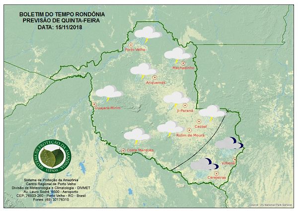 A Divisão de Meteorologia do Sistema de Proteção da Amazônia informa que a quinta-feira será de céu variando de parcialmente nublado a nublado em grande parte do Estado de Rondônia. Nessa região há previsões de pancadas isoladas de chuvas podendo ser acompanhadas de trovoadas. A exceção estará no cone sul, onde o tempo será mais instável, variando de nublado a encoberto. Nessa região a previsão é de um dia chuvoso.