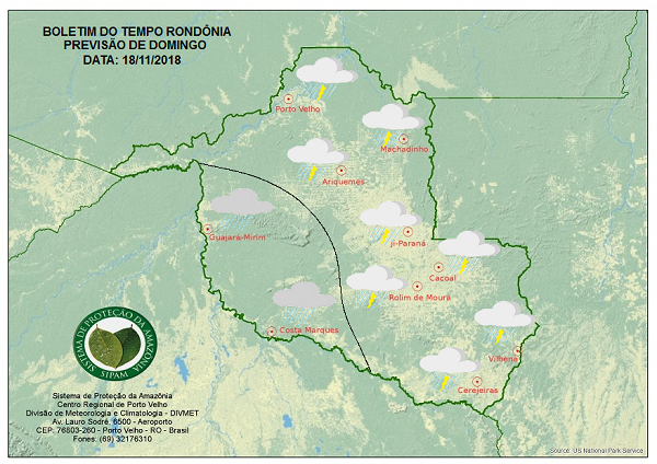 A Divisão de Meteorologia do Sistema de Proteção da Amazônia informa que o Domingo será chuvoso em todo o sul e oeste do Estado. No cone Sul, o tempo varia de nublado a encoberto. Nos vales do Guaporé e Mamoré o céu permanecerá nublado durante todo o dia. Nas demais áreas do centro-norte do Estado, incluindo a Capital Porto Velho, o tempo varia de parcialmente nublado a nublado e as chuvas ocorrem como pancadas podendo ser seguidas de trovoadas.