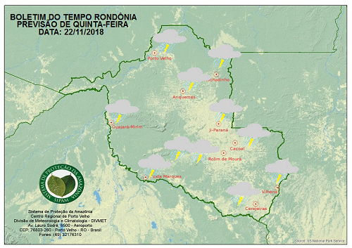 Nesta quinta-feira, a previsão para todo o Estado, inclusive a capital Porto Velho é de céu nublado, com sol entre muitas nuvens, tempo abafado e pancadas de chuva com trovoadas a partir da tarde.