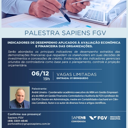 No dia 6 de dezembro, a Sapiens FGV realizará em Porto Velho a palestra sobre Indicadores de Desempenho Aplicados a Avaliação Econômica e Financeira das Organizações, ministrada pelo professor da FGV doutor em Administração André Limeira. O evento terá inicio às 19h00 e a entrada é gratuita mediante a doação de um brinquedo. As vagas são limitadas.