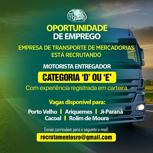 Empresa de transporte de mercadorias está recrutando pessoas para a seguinte vaga: Motorista entregador categoria D ou E, com experiência registrada em carteira.
