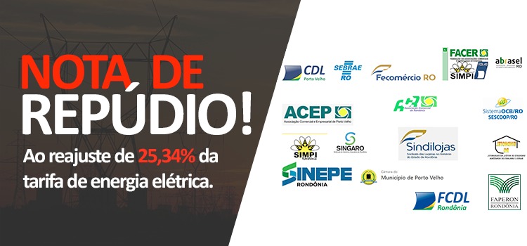 Os setores do Comércio, Indústria, Serviços e Turismo, por intermédio da Câmara de Dirigentes Lojistas de Porto Velho – CDL -, o Serviço Brasileiro de Apoio às Micro e Pequenas Empresas – Sebrae/RO, a Federação das Câmaras de Dirigentes Lojistas de Rondônia – FCDL -a Federação do Comércio de Bens, Serviços e Turismo de Rondônia – Fecomércio/RO -, a Federação das Associações Comerciais e Empresariais de Rondônia – FACER; a Associação Brasileira de Bares e Restaurantes – Abrasel/RO, a Associação Comercial de Porto Velho – ACEP, a Associação Comercial de Rondônia – ACR –, a Organização das Cooperativas Brasileiras – OCB/RO -, o Sindicato das Micro e Pequenas Indústrias de Rondônia – SIMPI-,– , o Sindicato das Empresas de Segurança Privada de Rondônia – Sindesp–, o Sindicato do Comércio Atacadista de Rondônia – Singaro -, o Sindicato dos Lojistas de Rondônia – Sindilojas-, o Sindicato dos Hotéis, Restaurantes, Bares e Similares de Rondônia – Sindhotel-, o Sindicato dos Estabelecimentos Particulares de Ensino de Rondônia – Sinepe/RO, assim como a Câmara Municipal de Vereadores de Porto Velho repudiam veementemente o reajuste de 25,34% da tarifa de energia elétrica autorizado pela Agência Nacional de Energia Elétrica (ANEEL) em 11/12/18 e que entra em vigor a partir desta quinta-feira (13.12.18), em todo o Estado de Rondônia.