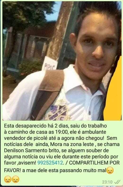 O jovem Denilson Sarmento Brito, 20 anos, está desaparecido desde a quarta-feira (19). Os familiares estão desesperados e já registraram um Boletim de Ocorrência sobre o sumiço do jovem, além de fazerem buscas em vários locais. Denilson trabalhava como picolezeiro e foi visto pela última vez na fábrica de picolé, quando deixou o local de bicicleta.
