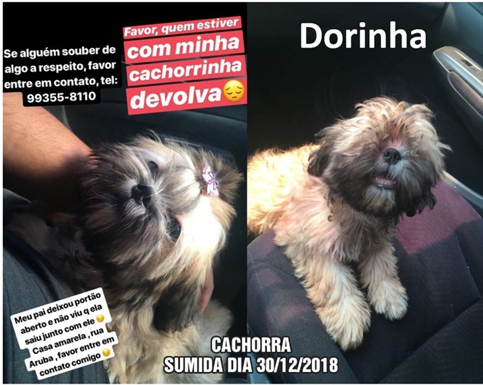 'Dorinha' esse é o nome da cadelinha que desapareceu na tarde de ontem (30) nas imediações das Ruas Aruba com José Amador dos Reis, zona Leste de Porto Velho. O cão é da raça 'Chitzu'.