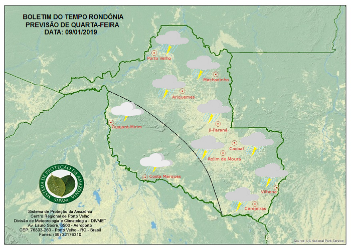 A Divisão de Meteorologia do Sistema de Proteção da Amazônia informa que a quarta-feira será de tempo nublado em grande parte do Estado. A previsão é de pancadas de chuvas e trovoadas. Somente nos vales do Guaporé e Mamoré o sol deverá aparecer por entre nuvens. Nessa região o tempo varia de parcialmente nublado a nublado e a previsão é de pancadas isoladas de chuvas e trovoadas.