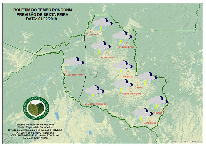 A Divisão de Meteorologia do Sistema de Proteção da Amazônia informa que a sexta-feira será de muita instabilidade na atmosfera de todo o Estado, fazendo com que haja bastante formações de nuvens em toda a região do Estado, havendo riscos de temporais em alguma regiões do centro sul Rondoniense.