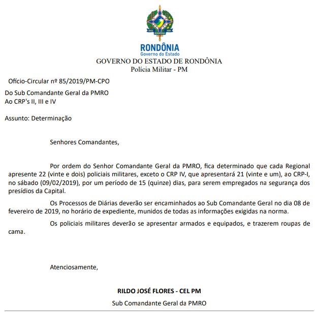 Na tarde de hoje (7) o Sub-Comandante Geral da PM, Coronel Rildo José Flores, fez um chamamento via ofício para várias unidades da corporação no estado, para transferir parte do efetivo dos Batalhões do interior e da capital para suprir a demanda nas ações dos presídios.