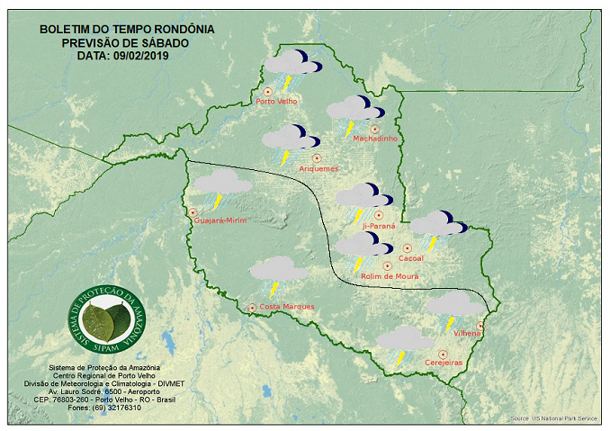 A Divisão de Meteorologia do Sistema de Proteção da Amazônia informa que ao longo deste fim de semana o tempo continua bastante instável em todas as regiões rondonienses. Para a Capital, o Vale do Jamari e região central do Estado, o sábado será de predomínio de sol entre muitas nuvens, deixando o tempo nublado, com período de céu encoberto e a qualquer hora do dia pode ocorrer pancadas de chuvas acompanhadas de trovoadas, com possibilidade de grande acumulados de chuva. Nas demais regiões rondonienses o tempo segue nublado e entre a tarde e noite ocorrem pancadas de chuvas com trovoadas.