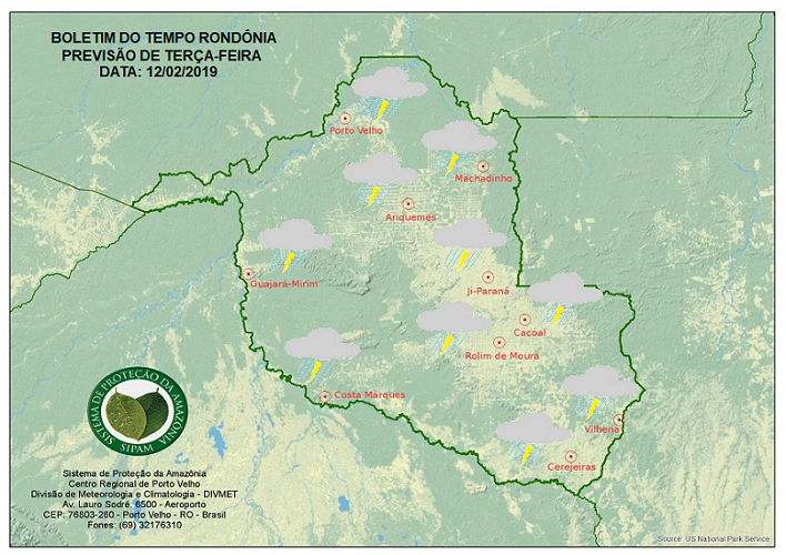 A Divisão de Meteorologia do Sistema de Proteção da Amazônia informa que a terça-feira será de muitas nuvens por todo o Estado. O tempo deverá permanecer nublado em todas as regiões e a previsão é de pancadas de chuvas e trovoadas entre a tarde e a noite. Há riscos de chuvas fortes.