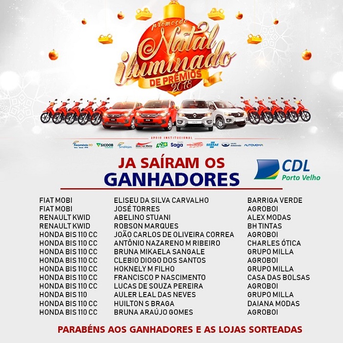 Essa foi a segunda edição do Natal Iluminado de Prêmios realizada pela CDL -. Neste ano a aposta da instituição foi investir ainda mais nas premiações para atrair os consumidores para as lojas participantes. Estratégia, que segundo a presidente da instituição, Joana Joanora, deu muito certo. “Ficamos muito satisfeitos com os resultados da promoção. O comércio vendeu mais e os clientes foram valorizados”. Ao comprar R$ 100,00 em produtos o cliente concorreu a quatro carros e dez motos zero Km.