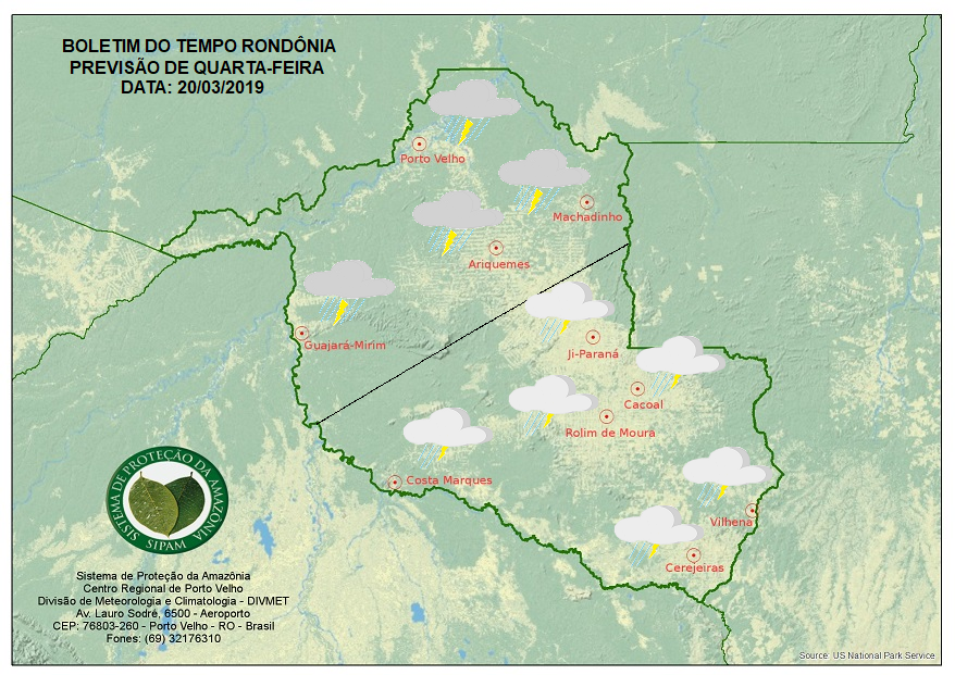 A Divisão de Meteorologia do Sistema de Proteção da Amazônia informa que a quarta-feira será de sol entre nuvens em todo o centro-sul Rondoniense. O céu deverá variar entre parcialmente nublado e nublado nessa região. O oeste e centro-norte do Estado deverá ter o céu nublado durante todo o dia.