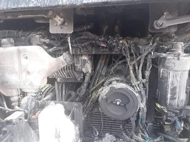 O motor do ônibus ficou totalmente queimado, o veículo se encontra em uma concessionária para descobrir o que aconteceu.
