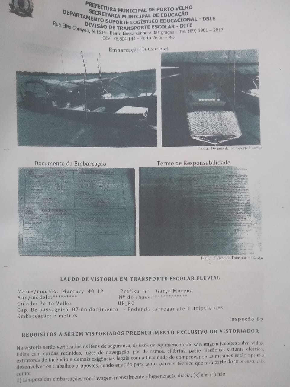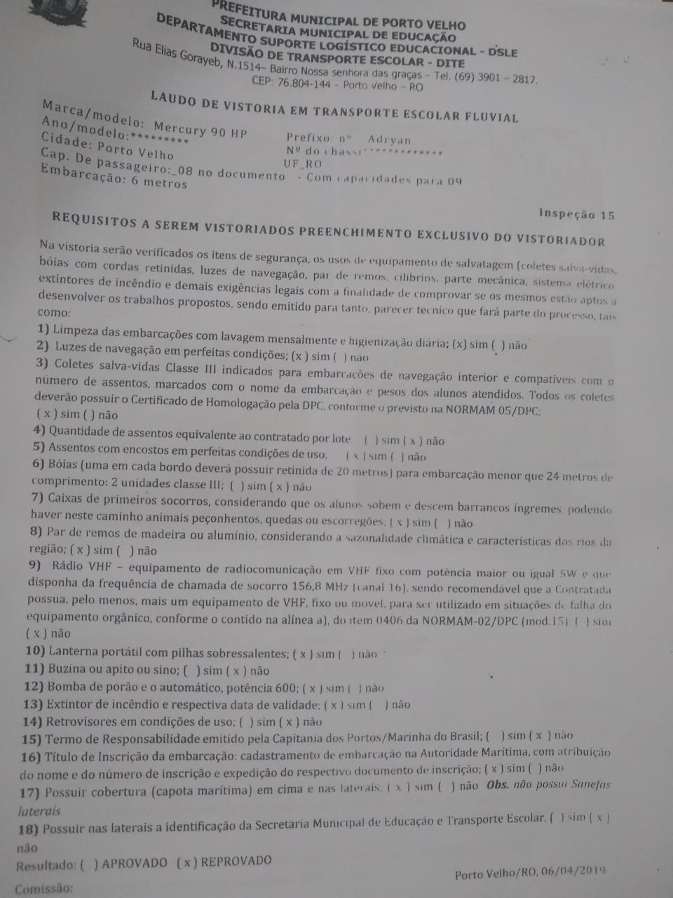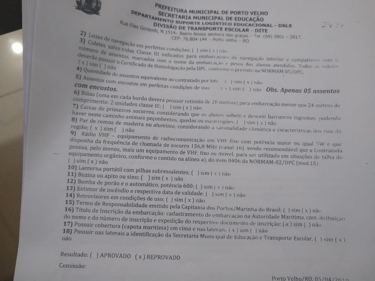 O Resultado é assustador, de acordo com o Registro de Inspeção emitido após as vistoria constatou-se que nenhuma das 19 embarcações apresentadas para a vistoria possuem as especificações necessárias para a realização do serviço de transporte escolar fluvial.