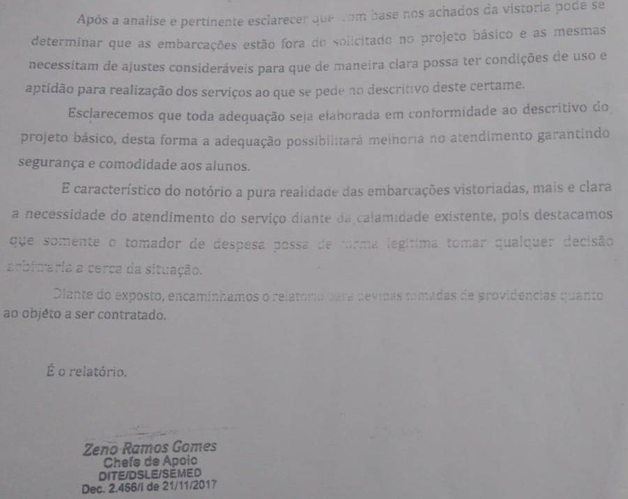 A inspeção foi realizada entre os dias 05 e 06 de abril e apresentada ao gestor do contrato, que tem a liberdade de dar continuidade ou não ao serviço, mesmo com o relatório especificando a não condição atual de utilização dessas lanchas.