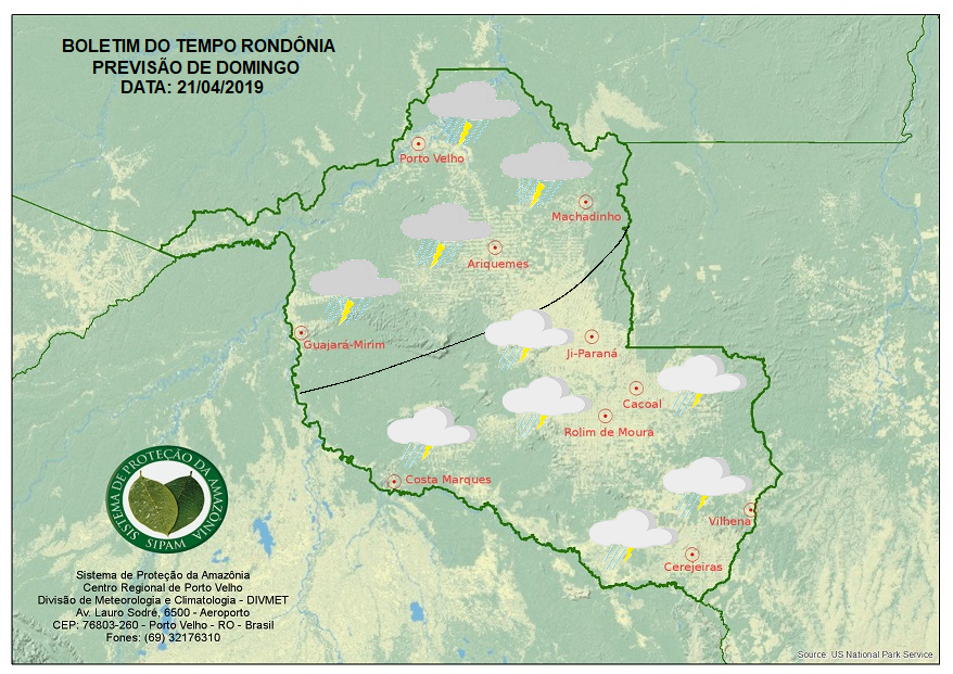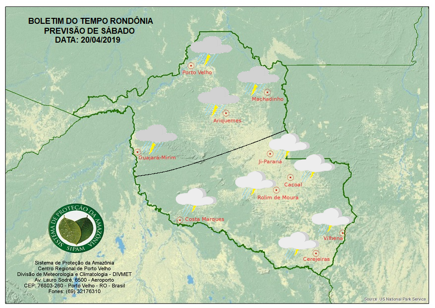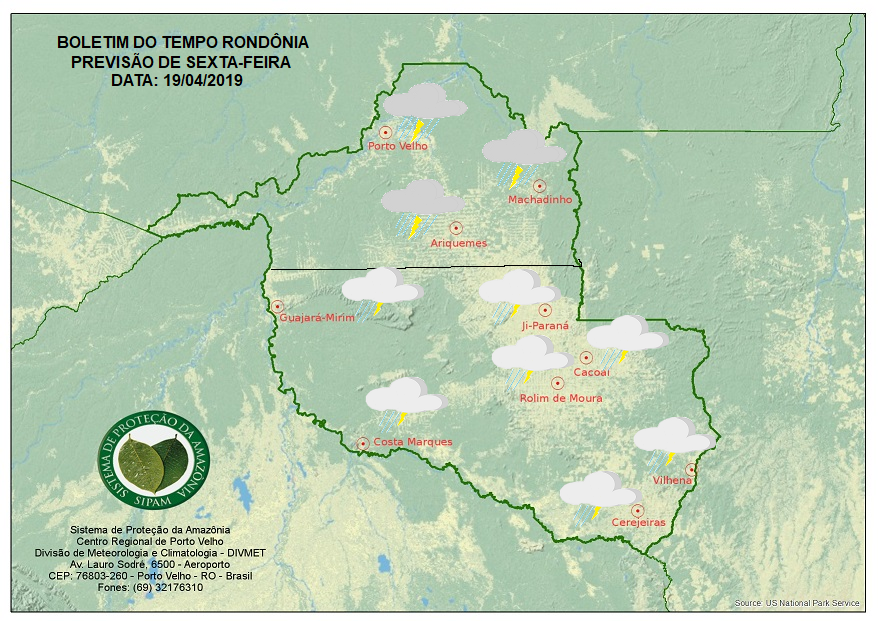 A Divisão de Meteorologia do Sistema de Proteção da Amazônia informa que nesta sexta-feira santa áreas de instabilidade ainda se espalha pelo Norte do país, fazendo com que o sol apareça sempre entre nuvens. A previsão para as regiões do Vale do Jamari e Norte do Estado, inclusive para a Capital Porto Velho é de céu nublado com pancadas de chuva e trovoadas que deverão ocorrer no período da tarde e noite. Nas demais regiões de Rondônia o sol predomina na maior parte do dia. O tempo varia de parcialmente nublado a nublado e ocorrem pancadas isoladas de chuva com trovoadas entre a tarde e à noite.