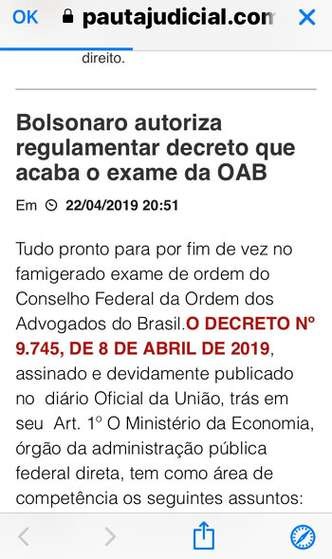 A Ordem dos Advogados do Brasil desmentiu notas que vem sendo publicado nas Redes Sociais que trata do fim da obrigatoriedade do Exame da Ordem dos Advogados do Brasil por meio de um Decreto do presidente Jair Bolsonaro publicado na presente data (23 de abril).