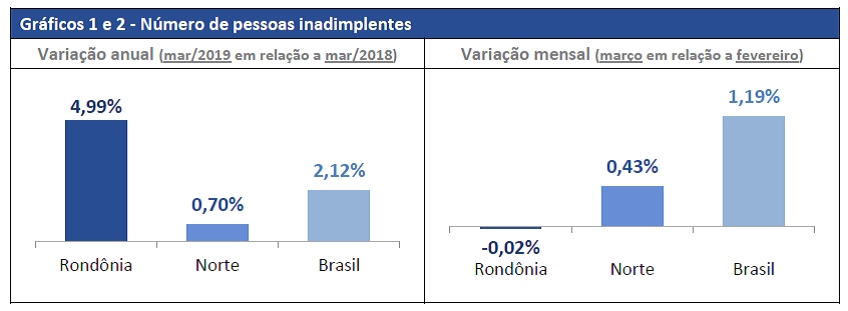 O dado ficou acima da média da região Norte (0,70%) e acima da média nacional (2,12%). Entretanto, na passagem de fevereiro para março de 2019 o número de devedores de Rondônia caiu -0,02%. Na região Norte, na mesma base de comparação, a variação foi de 0,43%