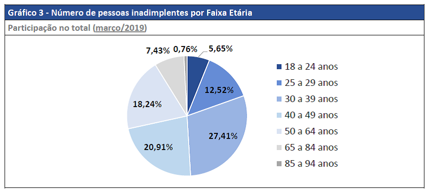 A abertura por faixa etária do devedor mostra que o número de devedores com participação mais expressiva em Rondônia em março foi entre 30 a 39 anos (27,41%). O setor com maior participação do número de dívidas em março no estado de Rondônia foi o comércio, com 34,27% do total de dívidas.