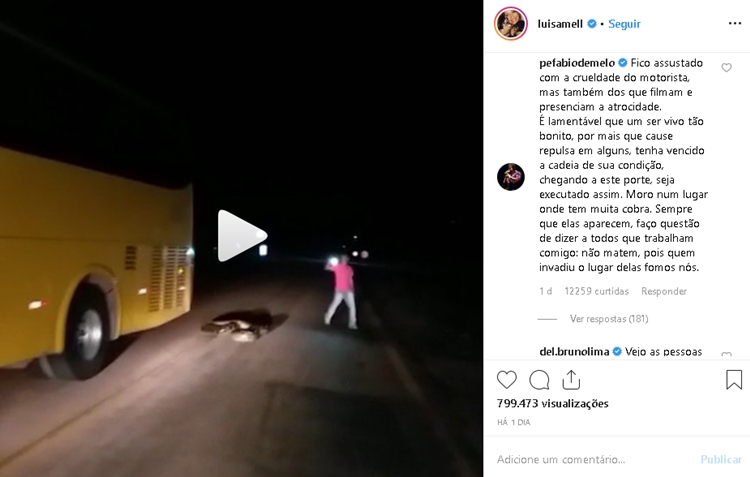 “Covarde, cruel e desnecessária esta atitude criminosa do motorista do ônibus da empresa IPÊ TRANSPORTE RODOVIÁRIO! Sim, ele passa várias vezes propositalmente em cima da cobra. Sei que muitas pessoas tem horror a cobras, por isso talvez não se abalem com tamanha crueldade. Mas todos animais são importantes para o equilíbrio ecológico”, declarou.