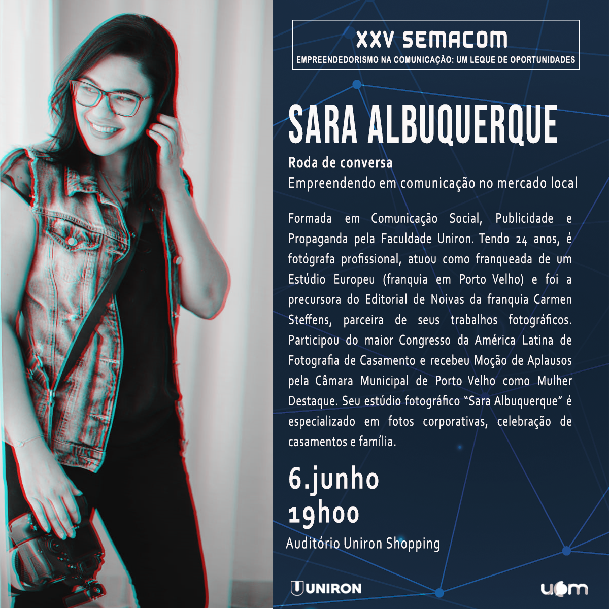 19h30 às 20h30 - Roda de conversa: empreendendo em comunicação no mercado local. Convidados: Sara Albuquerque Fotografias e Vanessa Mafra, Master Coach em Comunicação. Mediação: prof. Benedito Teles e prof. Viviane Camelo.