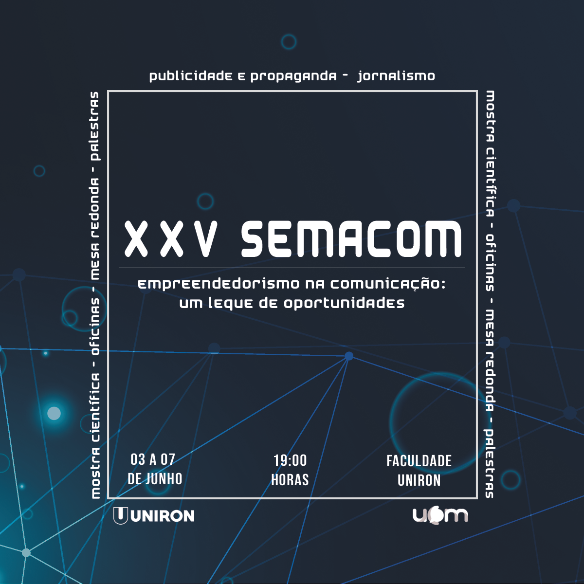 A XXV Semana de Comunicação dos Cursos de Jornalismo e Publicidade e Propaganda da Uniron acontecerá entre os dias 03 e 07 de junho, a partir das 19 horas, no auditório da Uniron, Campus Porto Velho Shopping.