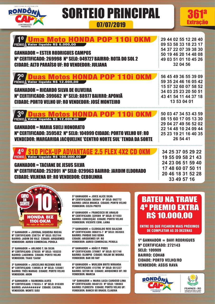 Os prêmios saíram para as cidades de: Porto Velho, Alto Paraíso, Vilhena, Ariquemes, Rolim de Moura e Cacoal