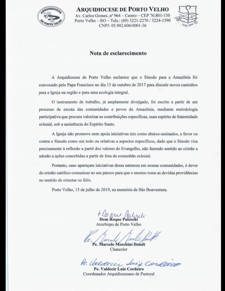 Em nota emitida pela Arquidiocese de Porto Velho no último dia 15 de julho, o Arcebispo da capital rondoniense, Dom Roque Paloshi, afirmou em nota de esclarecimento que a igreja não apoia nenhum movimento de abaixo assinado contra ou a favor de questões relacionadas ao Sínodo da Amazônia, que debate o tema dos povos da floresta dentro dos preceitos católicos.