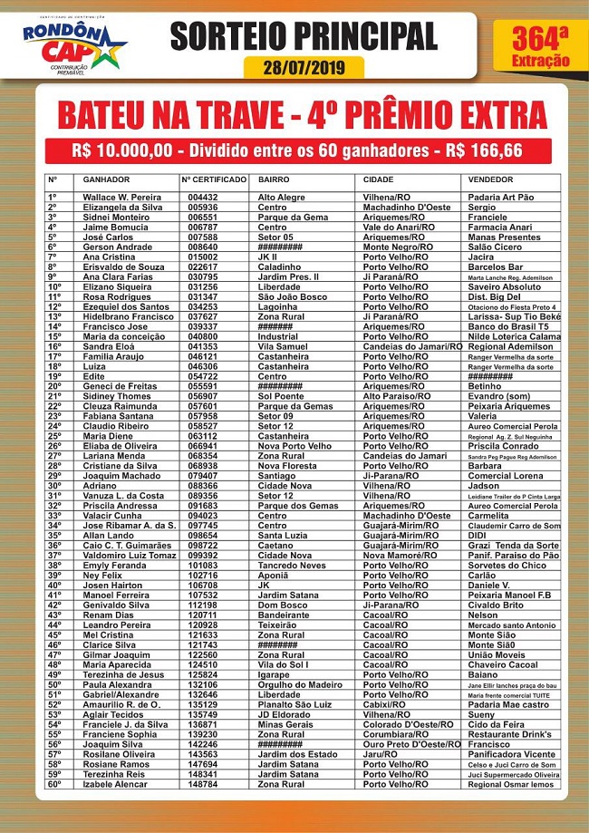 Os prêmios saíram para as cidades de: Porto Velho, Candeias do jamari, Buritis, Guajará Mirim, Ariquemes, Cacoal, Alto Paraiso, Cujubim, Ji Paraná, Vilhena, Machadinho do Oeste, Cerejeiras, Pimenta Bueno, Alta Floresta do Oeste, Vale do Anari, Monte Negro, Nova Mamoré, Cabixi, Colorado do Oeste, Corumbiara, Jaru e Ouro Preto do Oeste.