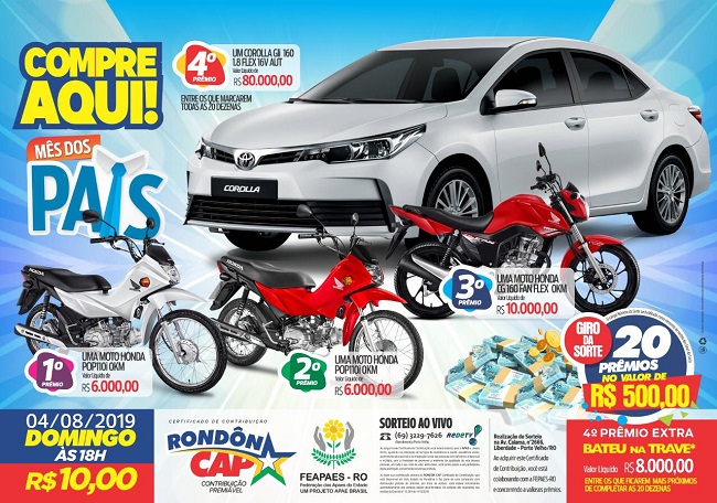E no próximo domingo o Rondoncap vai sortear um COROLA ZERO KILOMETRO, uma MOTO HONDA CG FAN 160 cilindradas e duas MOTOS HONDA POP. Serão 03 Motos Honda, e um COROLA zero kilometro, 20 Giros da sorte e o Bateu na Trave.