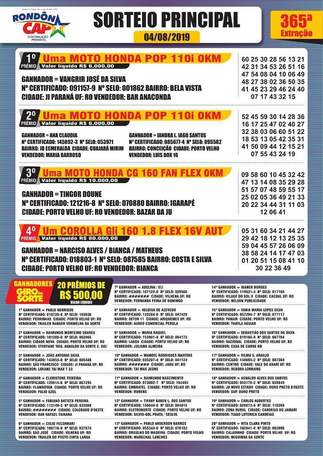 Os prêmios saíram para as cidades de Ji Paraná, Guajara Mirim, Porto Velho, Colorado do Oeste, Vilhena, Ariquemes, Jaru, Vale do Anari, Cacoal, Ouro Preto do Oeste e Candeias do Jamari.