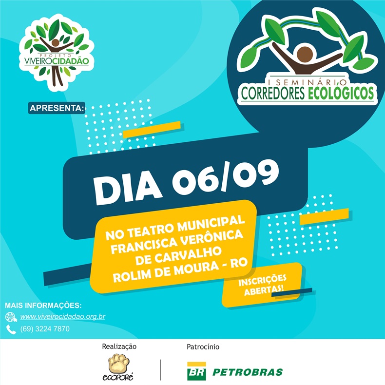 A Ação Ecológica Guaporé - Ecoporé promove, por meio do projeto Viveiro Cidadão, o I Seminário Corredores Ecológicos. O evento acontecerá no dia 06 de setembro, no Teatro Municipal Francisca Verônica de Carvalho em Rolim de Moura, e busca chamar a atenção para discussões quanto a conexão de áreas florestais, independentemente de seu tamanho e finalidade.