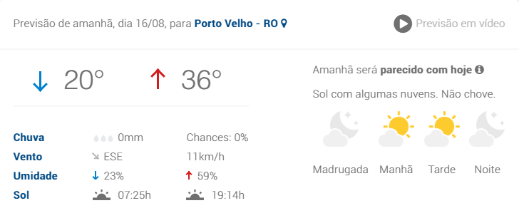 A Divisão de Meteorologia do Sistema de Proteção da Amazônia informa que o calor e o tempo seco continuam sobre Rondônia nesta sexta-feira. A previsão é de céu claro a parcialmente nublado em todo o Estado, inclusive na Capital. Poucas nuvens se formam ao longo do dia e não há previsão de chuva. A umidade do ar continua baixa em todas as regiões rondonienses, com valores mínimos abaixo de 25% no período da tarde.