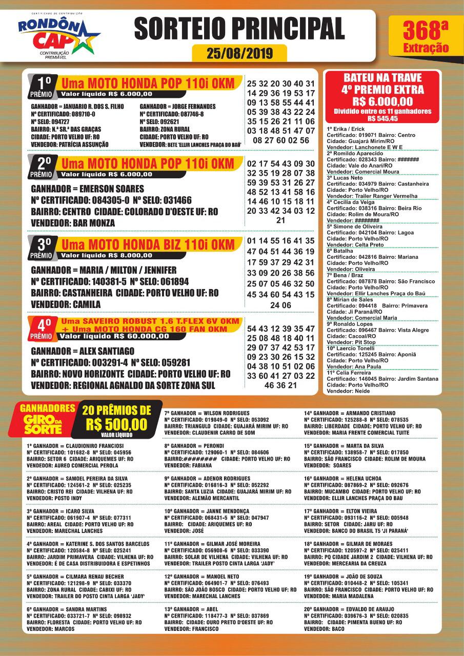 E para esta semana o Rondoncap preparou uma premiação sensacional: São 02 MOTOS HONDA BIZ, 01 MOTO HONDA TWISTER e no quarto prêmio tem um JEEP RENEGADE zero kilometro.