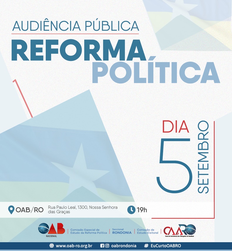 O projeto de Reforma Política que está em discussão no Congresso Nacional e que pode mudar a forma com são eleitos os nossos representantes políticos será tema de audiência pública em Porto Velho. A discussão acontecerá na sede da Ordem dos Advogados do Brasil (OAB), em Porto Velho, no dia 05 de setembro, às 19 horas.