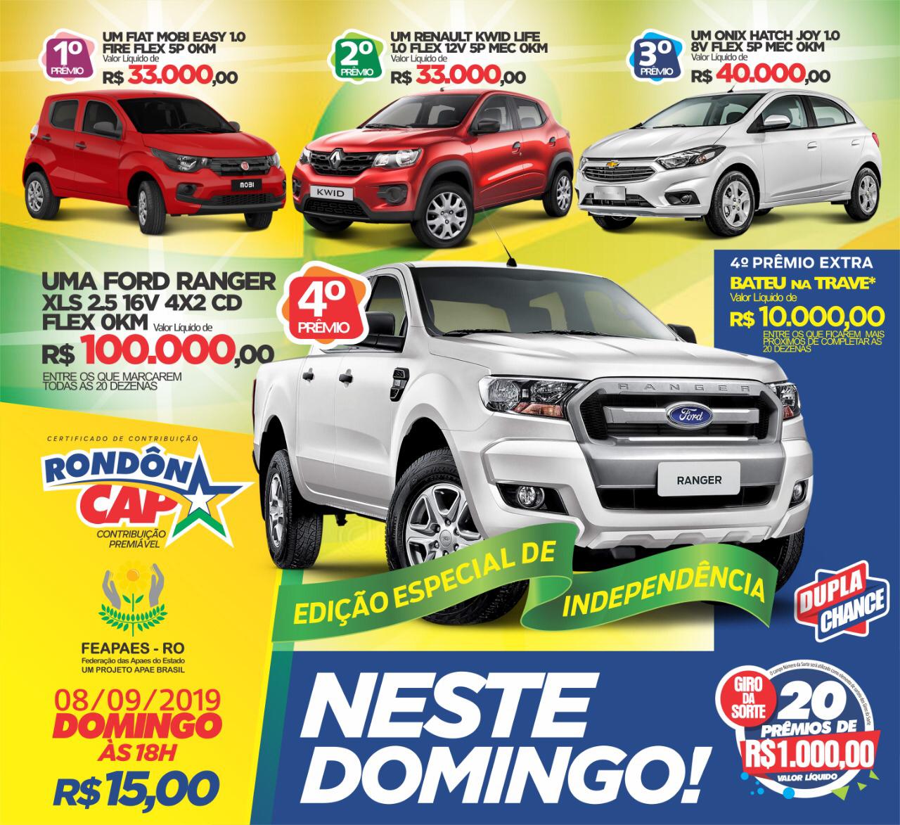 E a premiação do Rondoncap Especial da Independência está sensacional: são três carros e uma caminhonete Ranger zero kilometro que pode ir parar na sua garagem ou muito dinheiro no seu bolso.