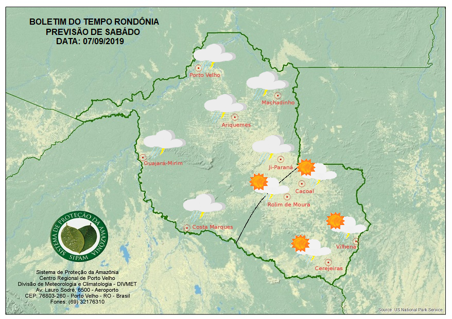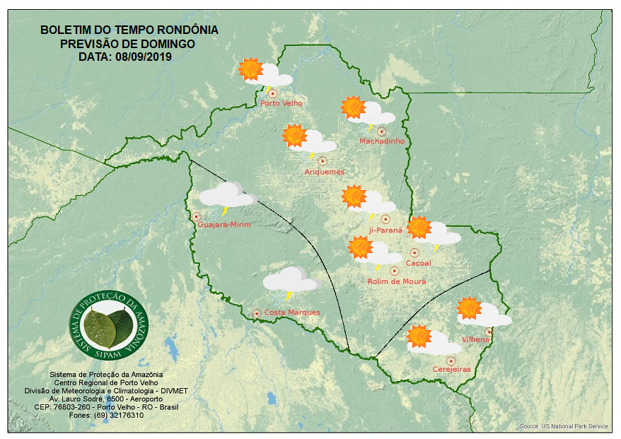 A Divisão de Meteorologia do Sistema de Proteção da Amazônia informa que ao longo deste fim de semana o tempo continua instável em todo o Norte Rondoniense. Para a Capital e regiões central, do Vale do Guaporé e do Vale do Jamari, o sábado será de predomínio de sol entre nuvens pela manhã e aumento de nebulosidade ao longo do dia, com o céu variando de parcialmente nublado a nublado e ocorre pancadas de chuvas e trovoadas em áreas isoladas entre a tarde e noite. Na região da Zona da Mata e Sul do Estado o sol predomina, faz muito calor e o tempo varia de claro a parcialmente nublado, com possibilidade de pancadas isoladas de chuva com trovoadas à tarde.