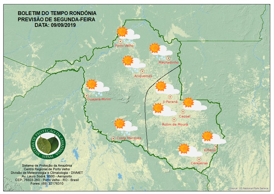 A Divisão de Meteorologia do Sistema de Proteção da Amazônia informa que o ar quente e seco volta a predominar sobre Rondônia nesta segunda-feira. A previsão é de um dia de céu claro a parcialmente nublado em todo o Estado, com muito sol e calor em todas as áreas. No Norte, Oeste e Nordeste do Estado há possibilidade de chuva passageira a tarde. Nas demais regiões rondonienses não há previsão de chuva.