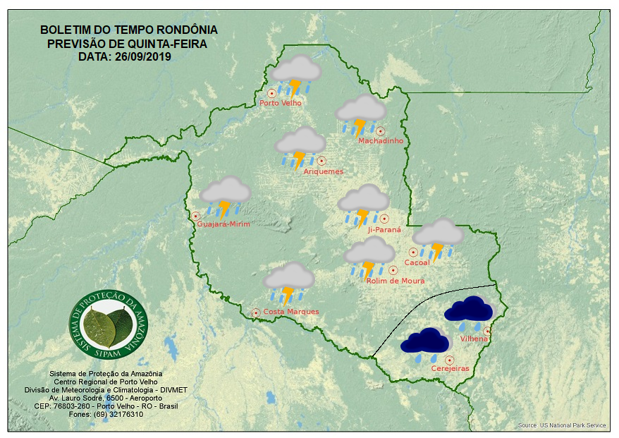 Nas demais áreas do estado a frente fria causará instabilidade atmosférica, trazendo pancadas de chuvas e trovoadas ao longo do dia. Nessa região o tempo deverá ser nublado durante todo o dia.