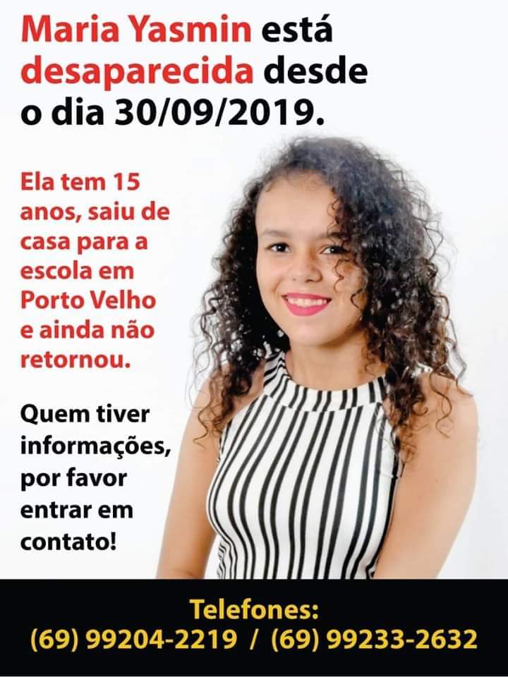 A adolescente Maria Yasmin, 15 anos, despareceu na tarde da última segunda-feira (30). A garota saiu de casa na rua Corinthians, bairro Lagoinha, em Porto Velho, e avisou a mãe que ia para a escola fazer um trabalho, porém, não voltou mais. Ela é aluna da Escola Barão do Solimões, na região central da cidade.