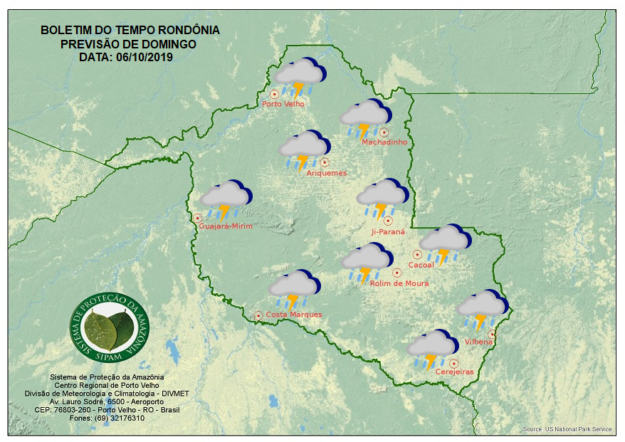 A Divisão de Meteorologia do Sistema de Proteção da Amazônia informa que o sábado ainda será de muita instabilidade em todo o estado. Há previsão de pancadas de chuvas que serão acompanhadas de trovoadas. O tempo deverá permanecer nublado em grande parte do estado, com exceção do cone-sul onde a nebulosidade deverá intercalar com momentos de céu parcialmente nublado. A noite um sistema de friagem deverá atingir o sul e o oeste Rondoniense, trazendo muitas nuvens, ventos fortes e chuva. As temperaturas deverão sofrer quedas nessa região deixando a madrugada mais fria.