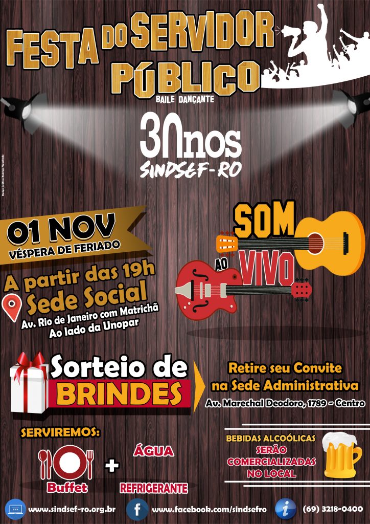 O Sindicato dos Servidores Públicos Federais no Estado de Rondônia – Sindsef/RO, em alusão ao Dia do Servidor Público e o aniversário de 30 anos de sua fundação, promoverá um jantar dançante no dia 1º de novembro (sexta-feira), véspera de feriado. O baile ocorrerá a partir das 19 horas, na Sede Social do Sindsef, localizado na Av. Rio de Janeiro com Rua Matrinchã, ao lado da Unopar, em Porto Velho.