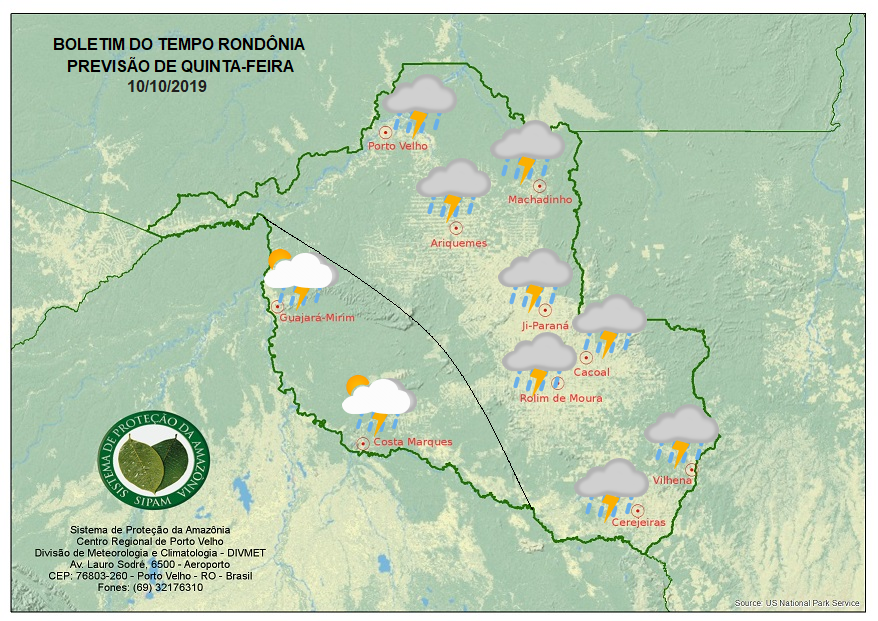 A Divisão de Meteorologia do Sistema de Proteção da Amazônia informa que na quinta-feira a previsão é de pancadas de chuvas e trovoadas em todo o estado. O fluxo de umidade vindo da Amazônia se intensifica possibilitando a formação de nuvens de chuvas em todo estado.
