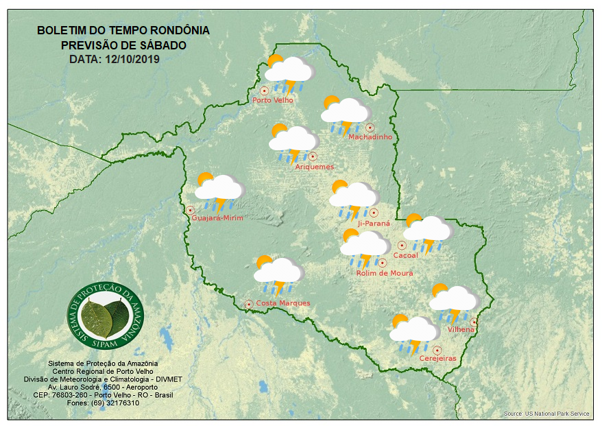 A Divisão de Meteorologia do Sistema de Proteção da Amazônia informa que o sábado será de muita instabilidade em todo estado de Rondônia. O fluxo de umidade proporcionará a formação de nuvens carregadas que deixarão o céu nublado durante todo o dia. A previsão é de pancadas de chuvas e trovoadas em todo o estado. Há riscos de chuvas fortes no oeste e cone-sul Rondoniense.