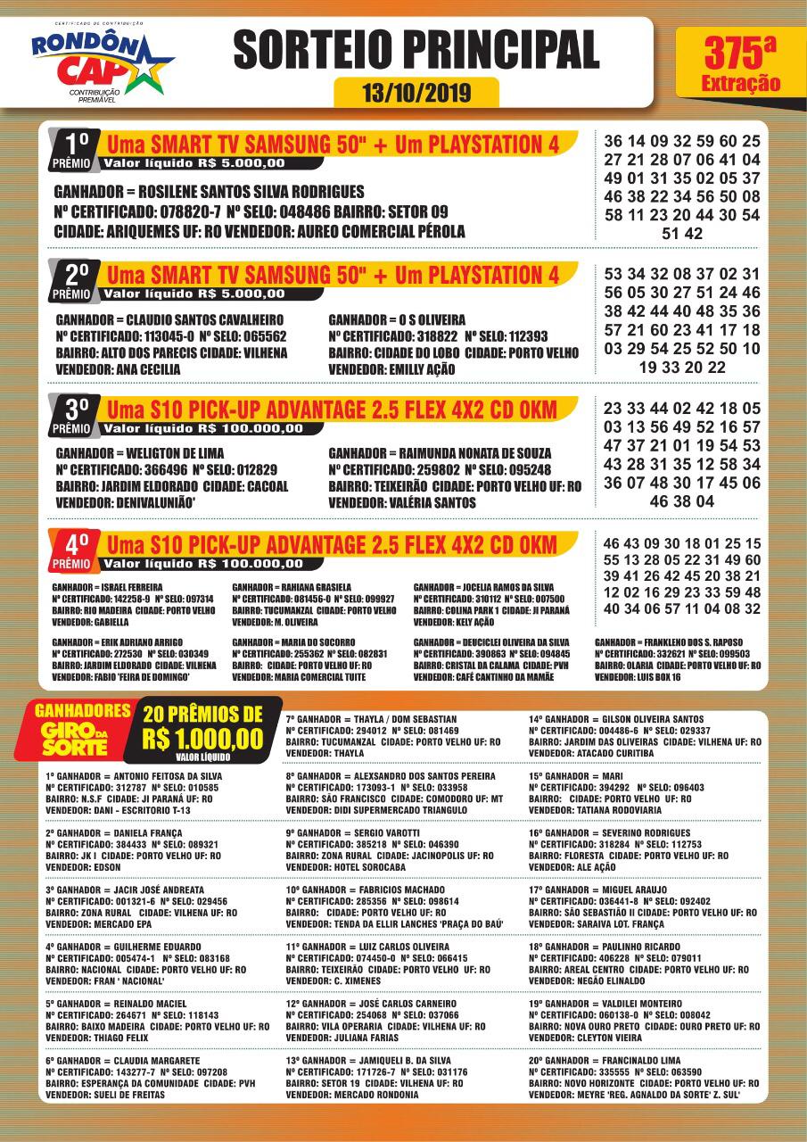 Os prêmios saíram para as cidades de Ariquemes, Vilhena, Porto Velho, Cacoal, Ji Paraná, Comodoro/MT, Jacinopolis, Ouro Preto do Oeste, Itapuã do Oeste, Colorado do Oeste, Rio Branco/AC, Vale do Paraíso, Nova Mutum, Buritis, Machadinho do Oeste, Guajará Mirim, Corumbiara, Jaru, Teixeropólis e Candeias do Jamari.