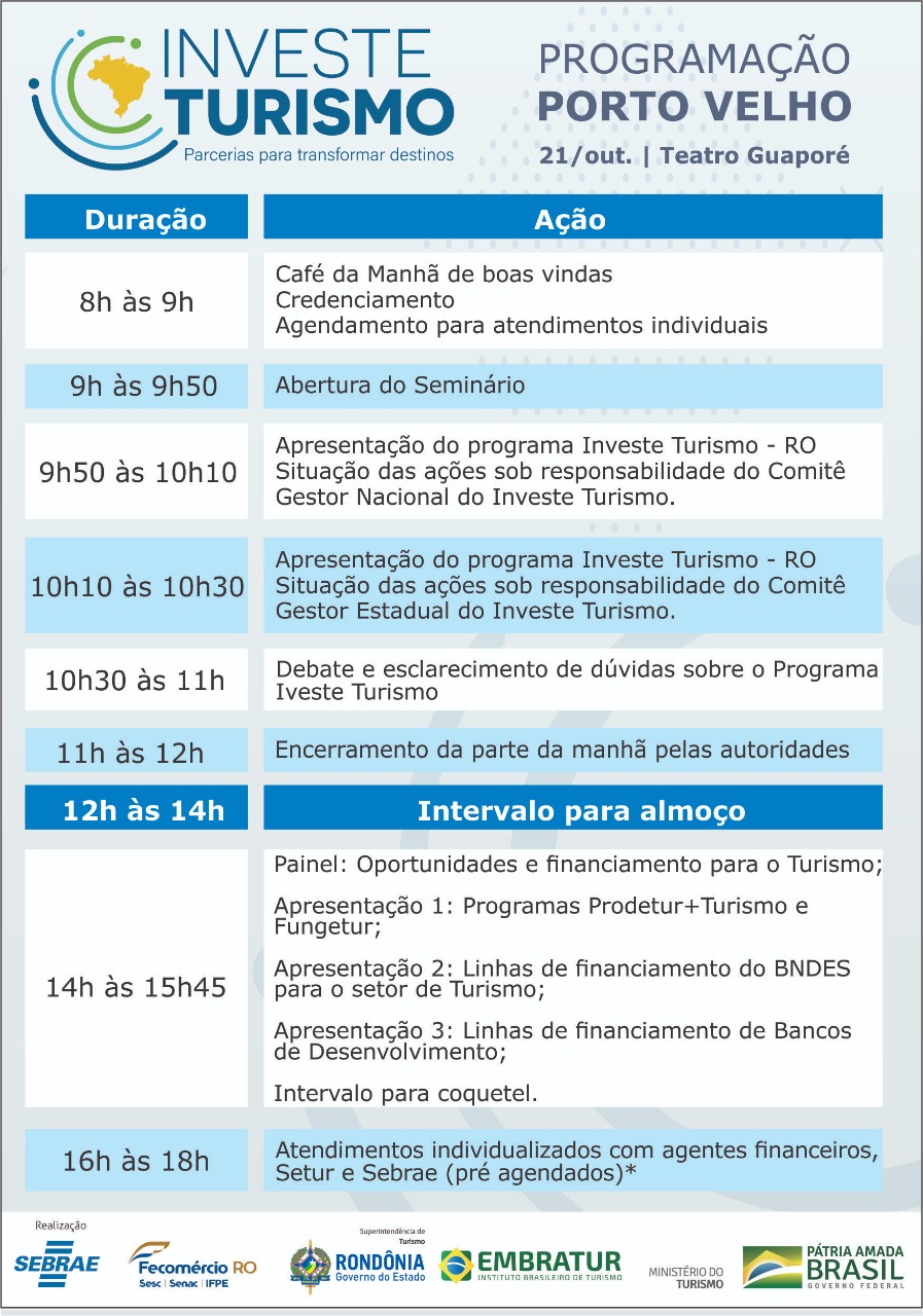 O Ministério do Turismo, Embratur, Governo de Rondônia e Sebrae realizam na próxima segunda-feira, 21 de outubro, o Seminário Investe Turismo. O Sistema Fecomércio/Sesc/Senac é parceiro do evento que acontece no Teatro Guaporé em Porto Velho das 08h às 18h.