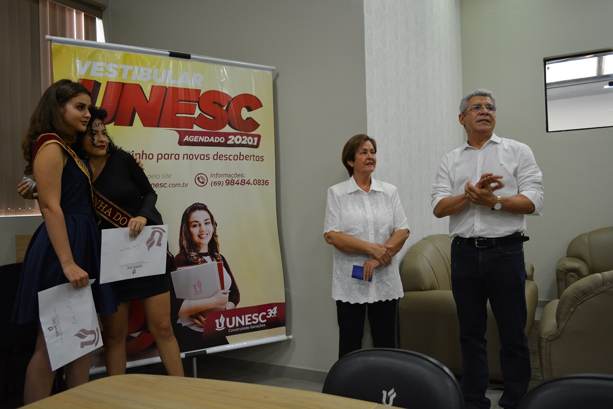 Horas antes da entrega das bolsas de estudo, a rainha e a princesa do café fizeram o Vestibular Agendado da Unesc. Elas puderam escolher o dia e a melhor hora para fazer a prova, ficaram tranquilas e tudo deu certo. Receberam a bolsa de estudos, já estando aprovadas no Vestibular.