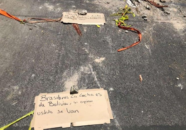 Durante os conflitos um cartaz com os dizeres: “Brasileiros essa luta é da Bolívia, se opinar vocês irão embora”, foi fotografado e mostrou a medida do clima de tensão ao quais cidadãos brasileiros estão vivendo.