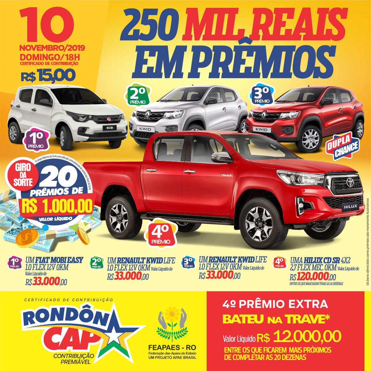 E neste domingo o Rondoncap vai sortear 03 carros e uma caminhonete Hilux zero kilometro. Compartilhe amor; ajude as Apaes e deixe a sorte ajudar você.