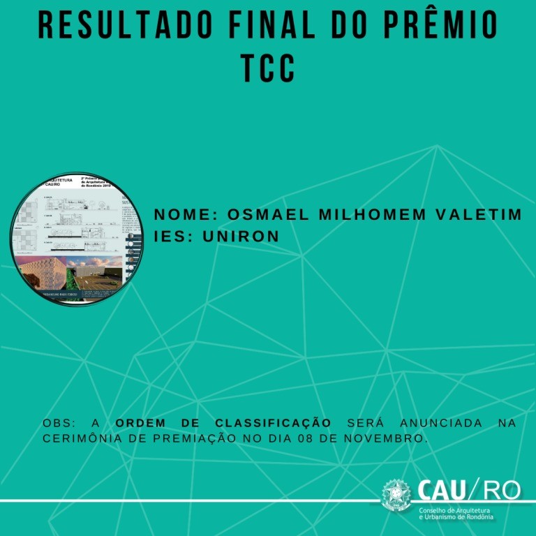 Osmael Milhomem Valentim está entre os 3 finalistas do processo de seleção. De acordo com o site do Conselho, a ordem de classificação será anunciada na cerimônia de premiação no dia 08 de novembro de 2019. Os trabalhos receberão os seguintes prêmios em dinheiro: