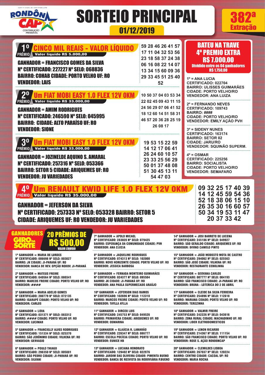 Os prêmios saíram para as cidades de Porto Velho, Alto Paraíso, Ariquemes, Ji Paraná, Vilhena, Pimenta Bueno, Machadinho do Oeste e Cacoal.